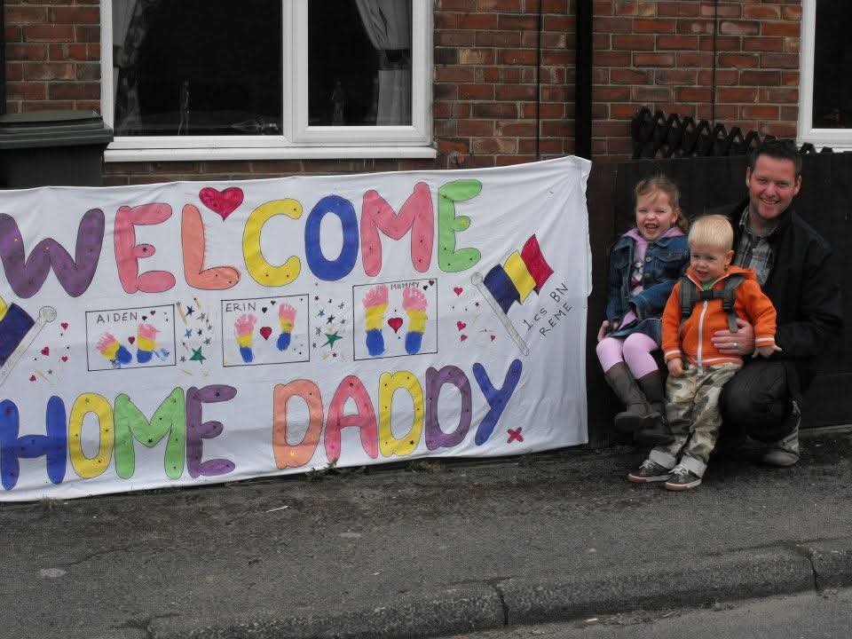 Mum sat on the floor and sketched a design that said: ’welcome home daddy’. She used red, yellow and blue, the colours of the Royal Electrical and Mechanical Engineers (REME). In between the words, she painted our feet and names to represent our family (and so we’d be able to look back and see how small we once were).