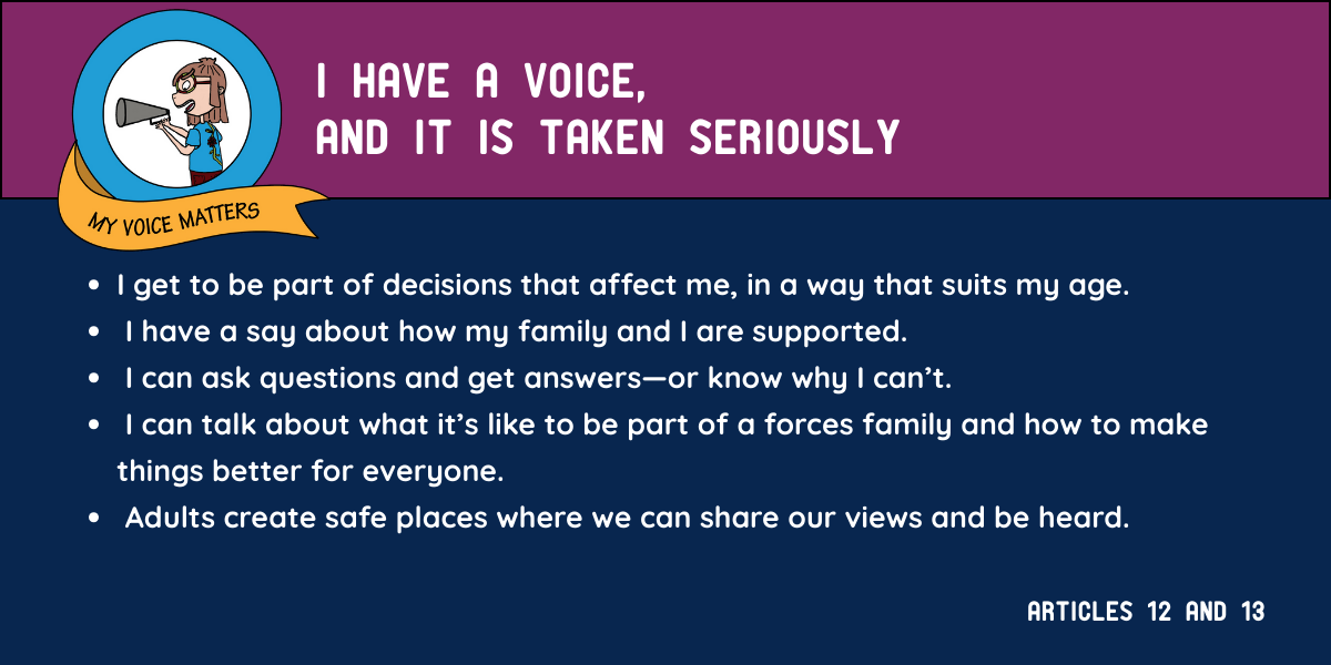 Children and young people recognise participation as an essential need, as outlined in the Forces Children’s Rights Charter: I have a voice, and it is taken seriously.